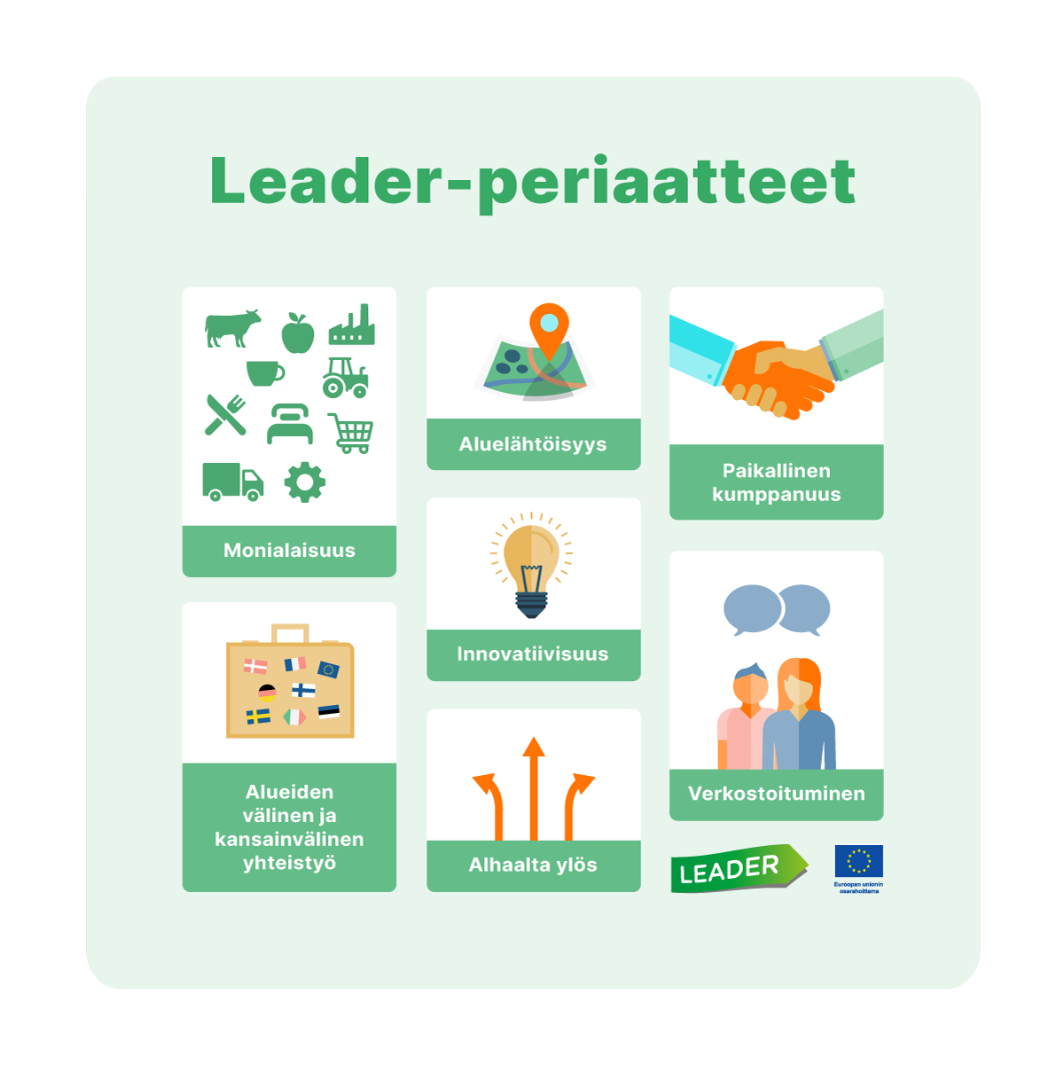 Leader on toimintatapa, jonka kantava teema on ns. bottom-up-periaate. Tämä tarkoittaa, että hankkeiden valmistelu ja päätösvalta ovat paikallisilla asukkailla, joilla on paras asiantuntemus omasta kotiseudustaan. Leader-tuki koostuu EU:n, valtion ja kuntien rahoituksesta.